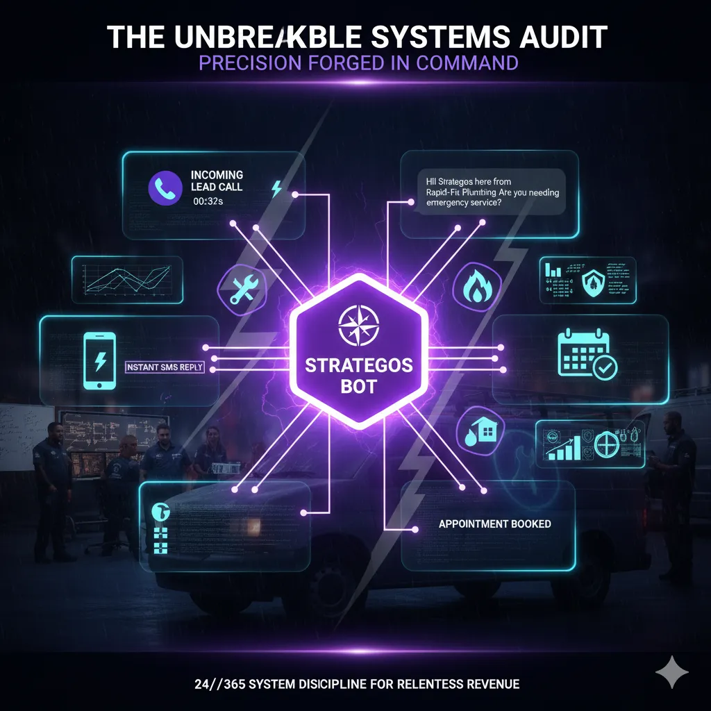 A: The Strategos Bot is your $\mathbf{24/7\ Discipline\ System.}$ For a high-urgency business like Plumbing or HVAC, it solves two massive problems: